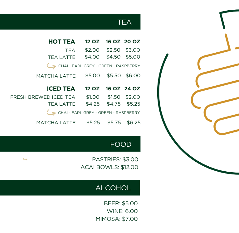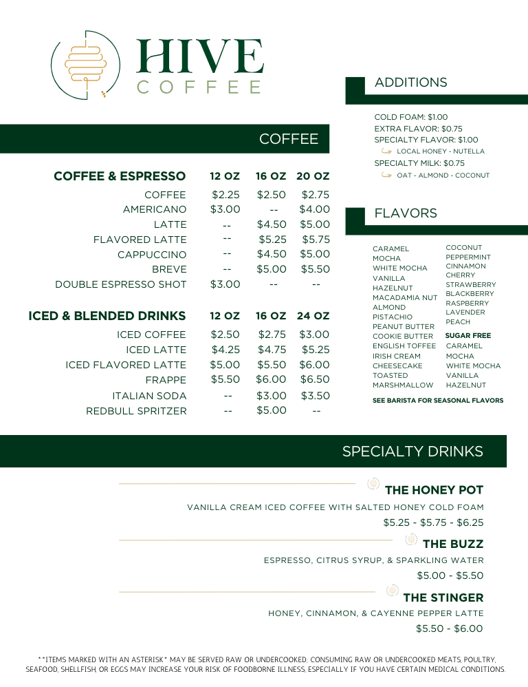 From a reviewer’s perspective, the menu at Hive Coffee Bar offers a well-rounded selection of drinks and light bites that suit both quick visits and relaxed afternoons. Their coffee lineup includes classics like Coffee, Americano, Cappuccino, Latte, and the Flavored Latte, while cold options such as Iced Coffee, Iced Latte, Iced Flavored Latte, and Frappe provide refreshing alternatives. The specialty drinks-The Honey Pot, The Buzz, and The Stinger-add a creative twist to the menu and are worth trying for something different. Tea lovers can enjoy Fresh Brewed Iced Tea, Tea Latte, and Matcha Latte, while food options like Pastries and Acai Bowls pair nicely with any drink. The menu also includes unique extras like Italian Soda, Redbull Spritzer, Mocha, White Mocha, and even a Mimosa for those looking for a light alcoholic option. Overall, the variety and creativity in both drinks and light food make the menu appealing and versatile for many tastes.